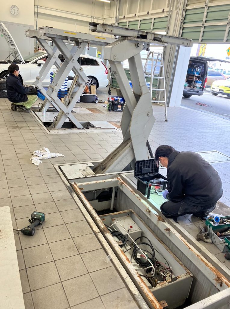 お客様の大切なお車を持ち上げるリフトは、日々の点検・整備を行う上で欠かせない重要な設備です。