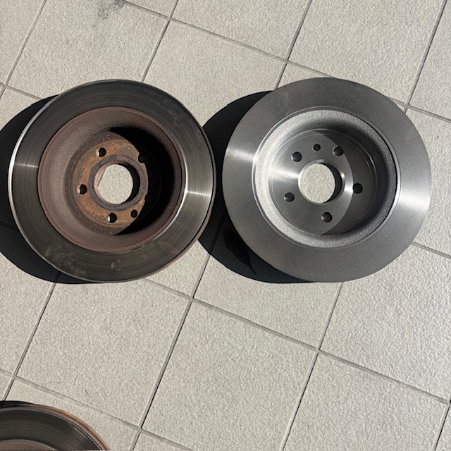 左側が交換前で右側が新品のブレーキディスクローターです。